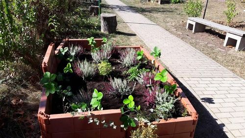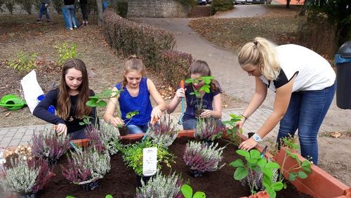 Vieles, was verwelkt war oder zu sehr wucherte, musste beschnitten werden. Da sehr viel Müll herumlag, mussten wir immer wieder Glas, Papier, Plastik, Bananenschalen u.Ä. aufheben und in Müllsäcke füllen. Die Felder wurden gereinigt, Unkraut entfernt, Blätter zusammengerecht und zum Kompost gebracht. Eine besondere Aufgabe war das Bauen des Hochbeetes: Zuerst steckten wir die Teile zusammen, dann wurden Kies und abgeschnittene Zweige eingefüllt. Als wir vom Bauhof der Stadt Sulzbach Mutterboden bekommen hatten, konnte das Beet damit gefüllt werden. Zum Schluss wurden noch zwei Säcke Blumenerde darauf verteilt: dann konnte das Beet bepflanzt werden. Johannas Vater hatte und Erdbeerpflanzen, Efeu, ein Rosenstöckchen und blühende Erikabüsche gespendet. Außerdem kamen viele Blumenzwiebeln (Tulpen, Osterglocken, Krokusse, Schneeglöckchen) in die Erde (und das nicht nur im Hochbeet). Eine biblische Pflanze konnten wir auch setzen, einen Ysop, den uns eine Presbyterin der ev. Kirchengemeinde geschenkt hat. Da es sehr trocken war, mussten wir auch gießen und mit den Schlauch spritzen. Die Arbeit war anstrengend, aber durch das Zusammenwirken der ganzen Reli-Gruppe wurde der Garten immer schöner. Jetzt ist er sauber und sieht viel besser aus. Uns haben diese Religionsstunden gefallen, wir haben uns wohl gefühlt und waren glücklich. Hoffentlich bleibt der Garten so schön!" Noch eine kleine Ergänzung: