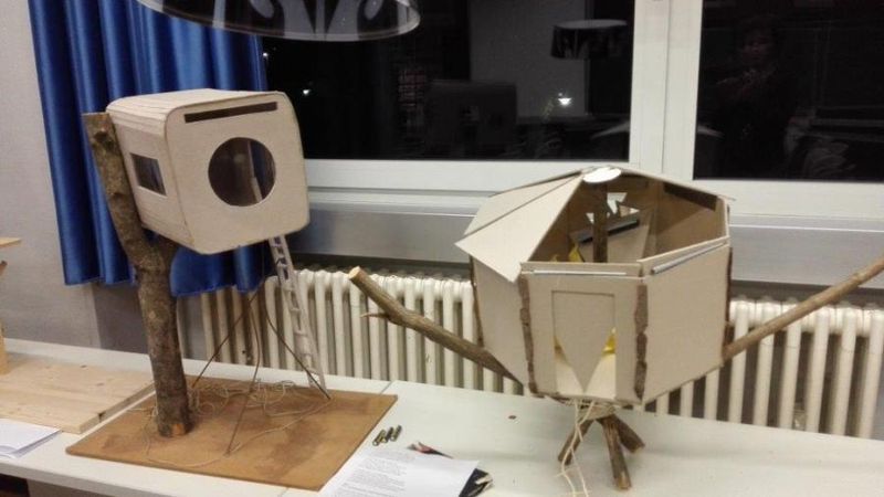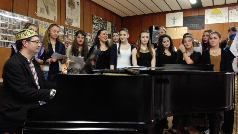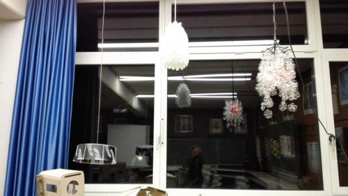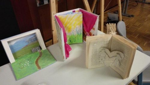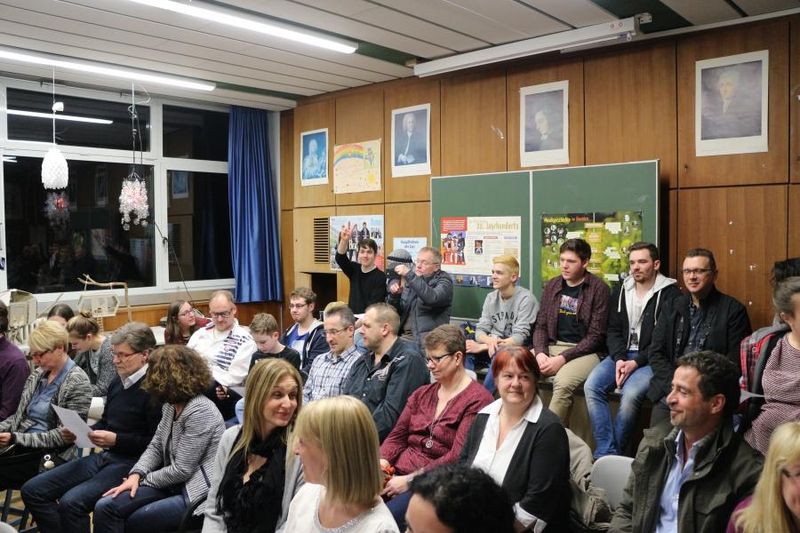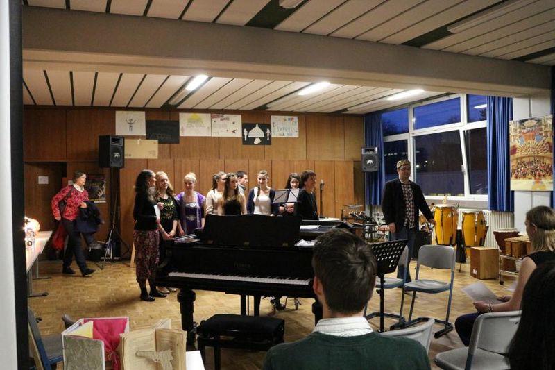 Eröffnet wurde der Abend mit dem Titel „Riptide" von Vance Joy, den Dana Hoffmann gemeinsam mit einem kleinen Backgroundchor darbot. Ihre kräftige, melancholische Stimme verband sich perfekt mit ihrer einfühlsamen Gitarrenbegleitung. In drei Blöcken präsentierten dann Annalena Schmidt und Felix Burkhard die Exponate des Kunstkurses von Frau Montag, zum einen futuristisch wirkende Baumhäuser aus Holz, Pappe und Kunststoff, Lampen aus den verschiedensten Materialien wie abgebrochenen Plastiklöffeln, Böden von PET-Trinkflaschen, geschmolzenen CDs, zum anderen Bücher, aus denen dem jeweiligen Genre entsprechend gefaltete Blumen, Schmetterlinge oder eine Pistole erwuchsen. Eine weitere Aufgabenstellung war eine Fotoserie zum Thema „Abschied vom THG". Zwischen den Präsentationen des Kunstkurses sangen die Musikkurse von Frau Keller-Sandner und Herrn Klein den Titel „Wonderwall" von Oasis. Hannah-Maria Britz und Katharina Pannwitt präsentierten außerdem Teile ihres Programms für die fachpraktische Abiturprüfung in Musik. Hannah-Maria spielte eine Sinfonia von J. S. Bach sowie den ersten Satz der „Estampes" von C. Debussy auf dem Klavier, Katharina die Romanze F-Dur von L. v. Beethoven auf der Violine. Zum Abschluss des Abends sangen die Musikkurse gemeinsam mit dem Publikum den Song „Lemon Tree".